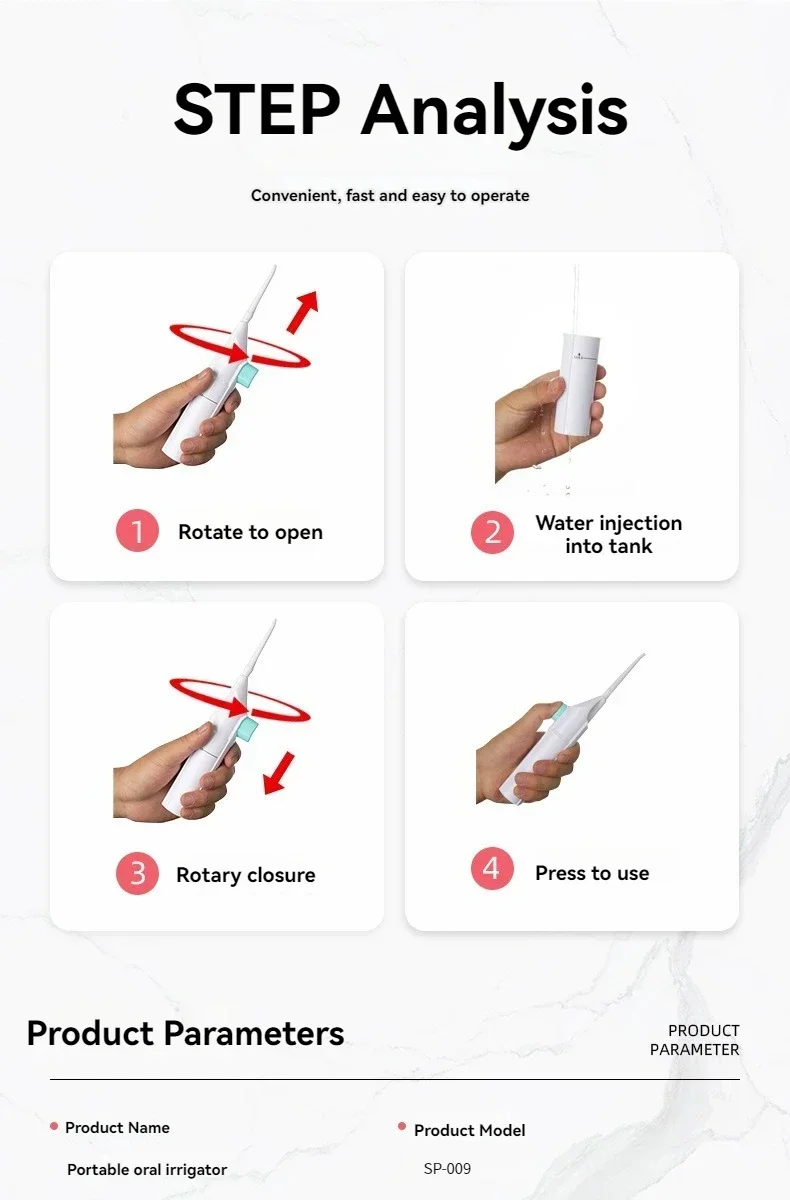 • Design Portatile: Progettato per la comodità, questo irrigatore orale è facile da portare in giro, rendendolo perfetto per la cura dentale in movimento.