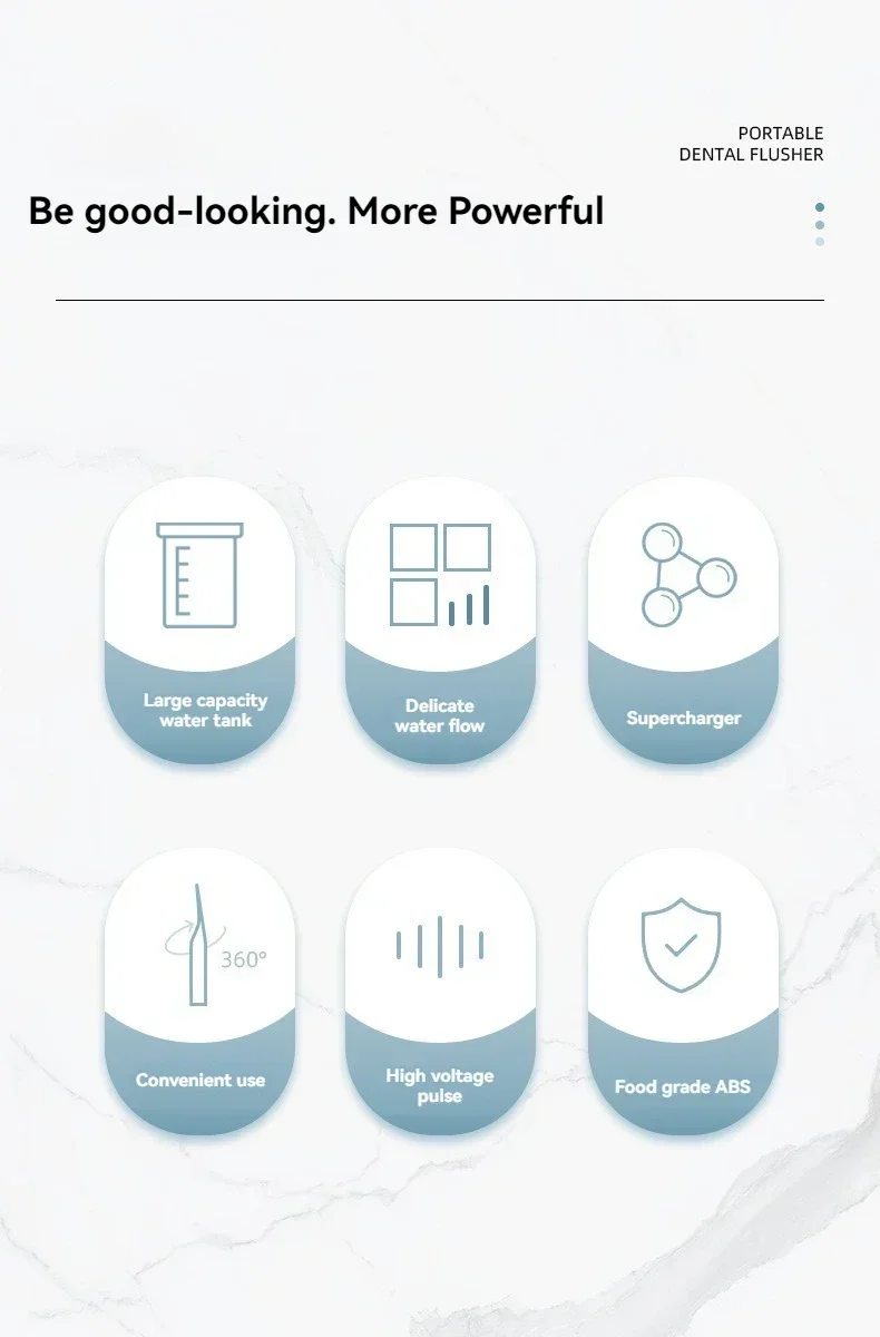 • Irrigatore Orale ad Alta Pressione: Questo strumento dentale portatile pulisce efficacemente i tuoi denti, raggiungendo aree che lo spazzolamento non può, prevenendo carie e malattie gengivali.